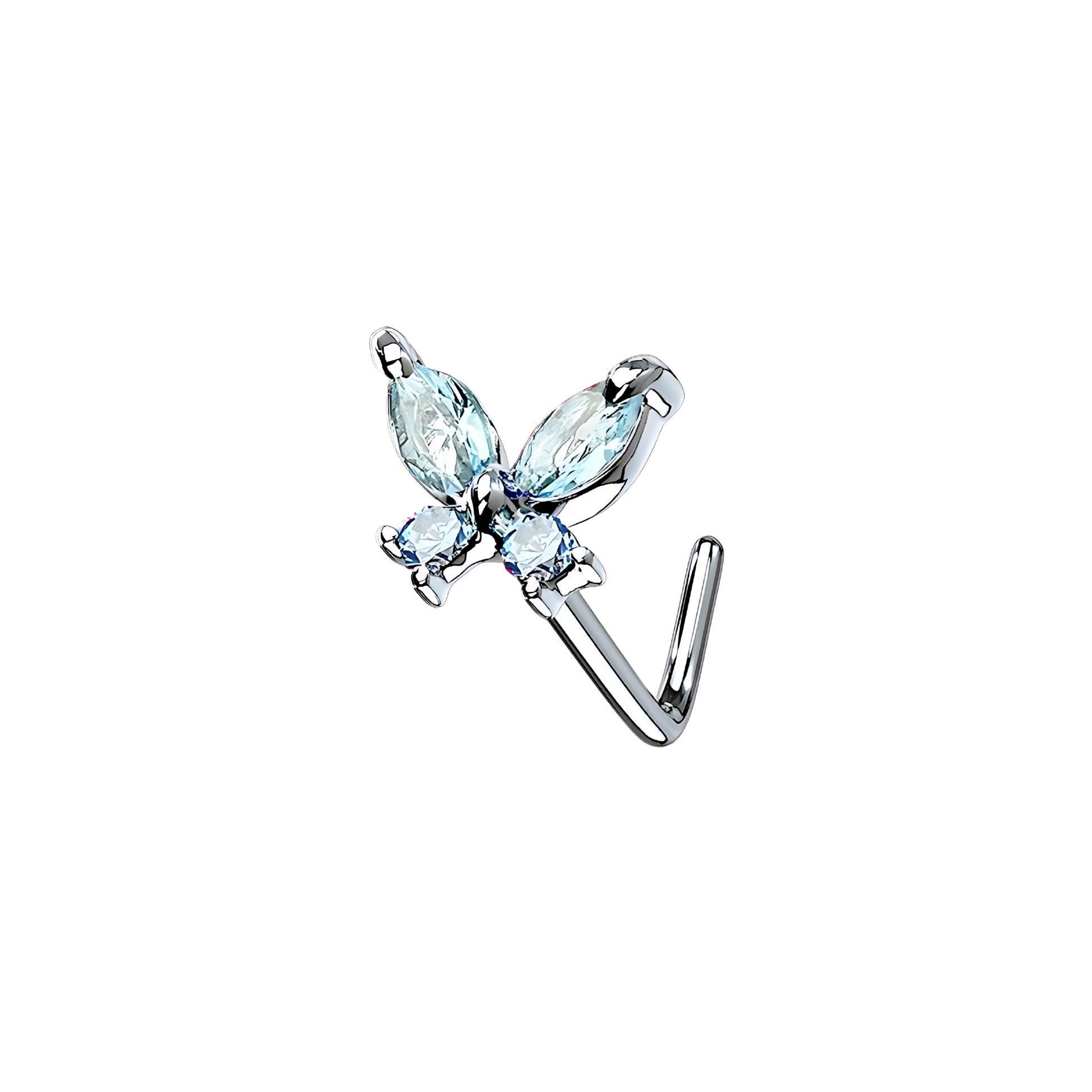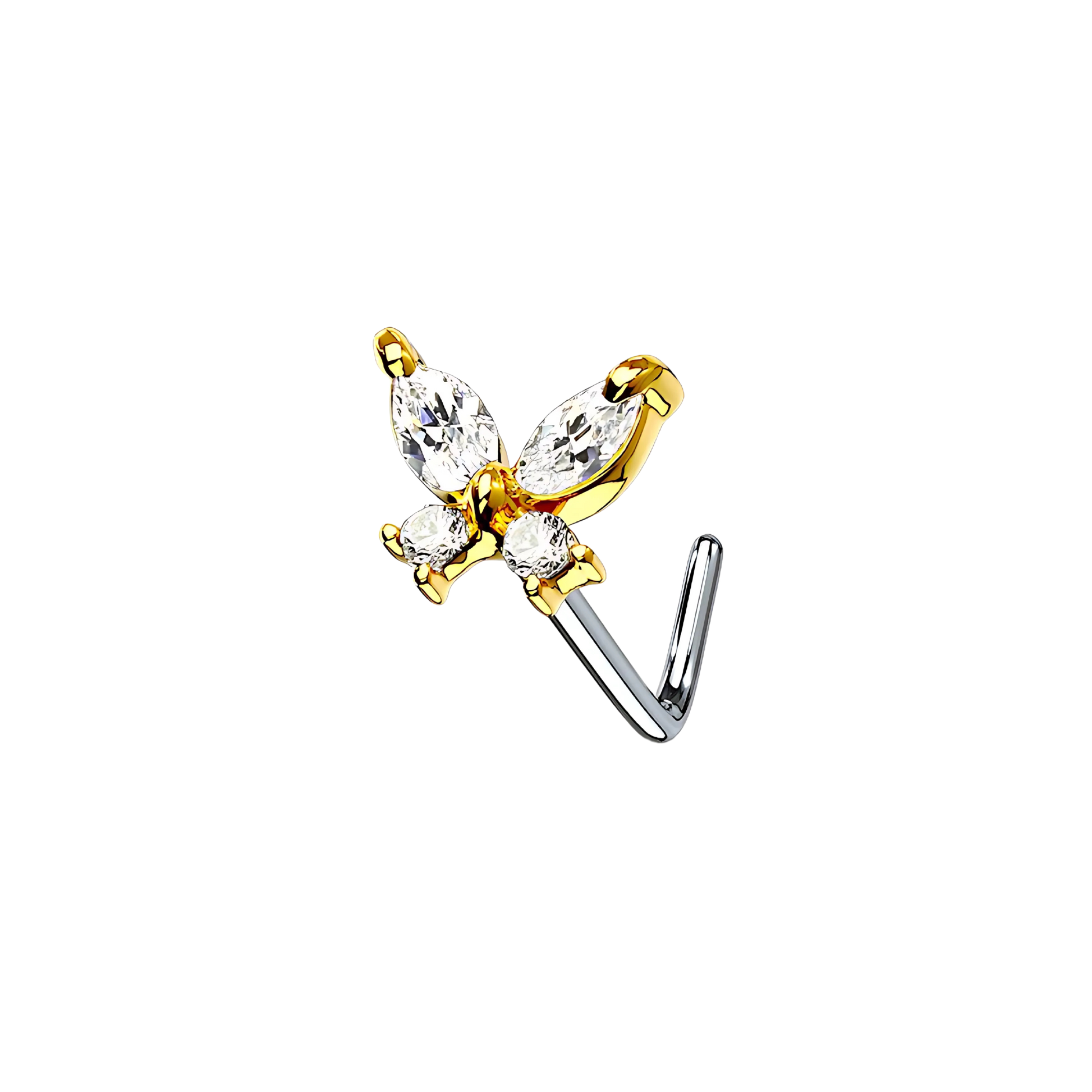 Piercing tipo nostril con cierre en L, un diseño en forma de mariposa, disponible en varios colores