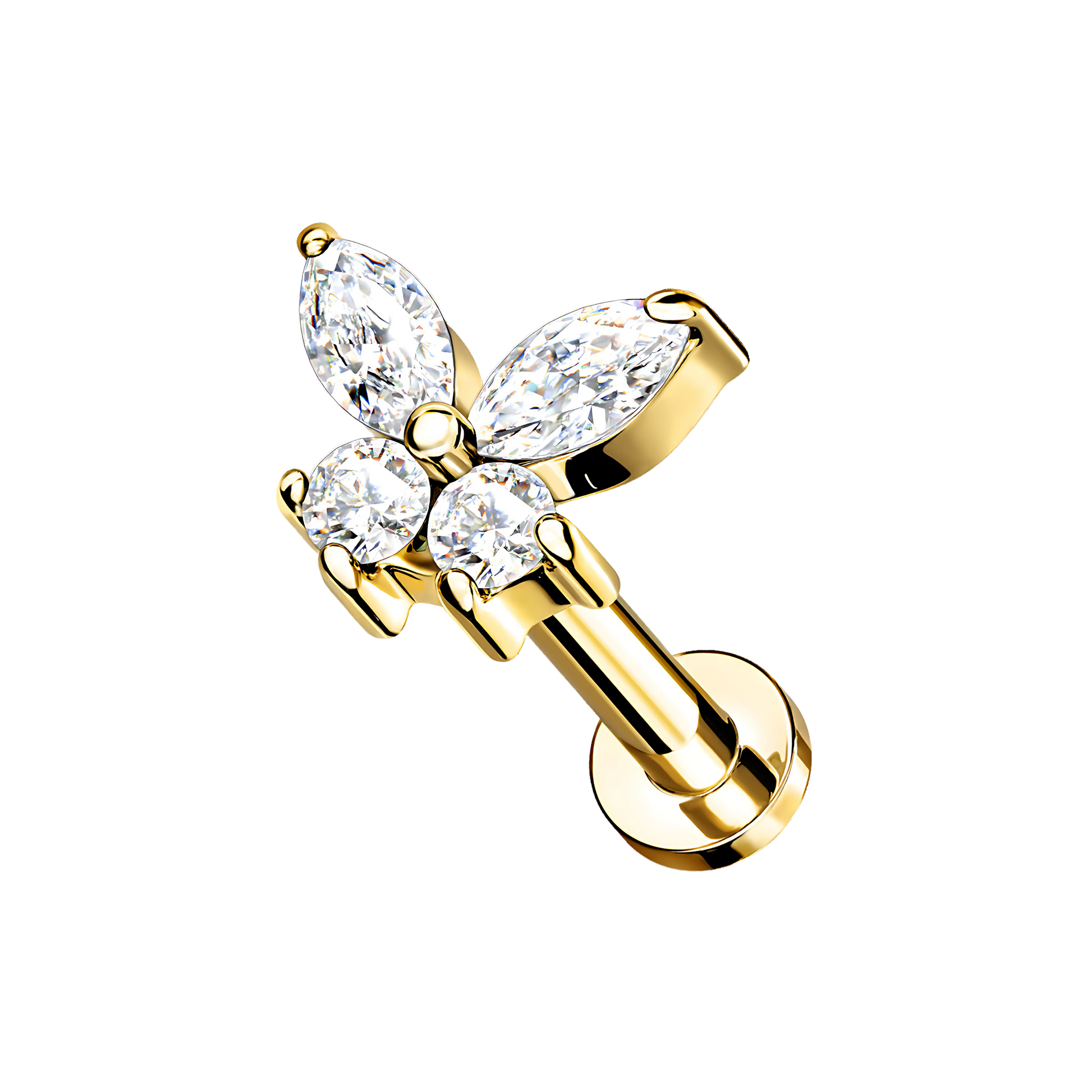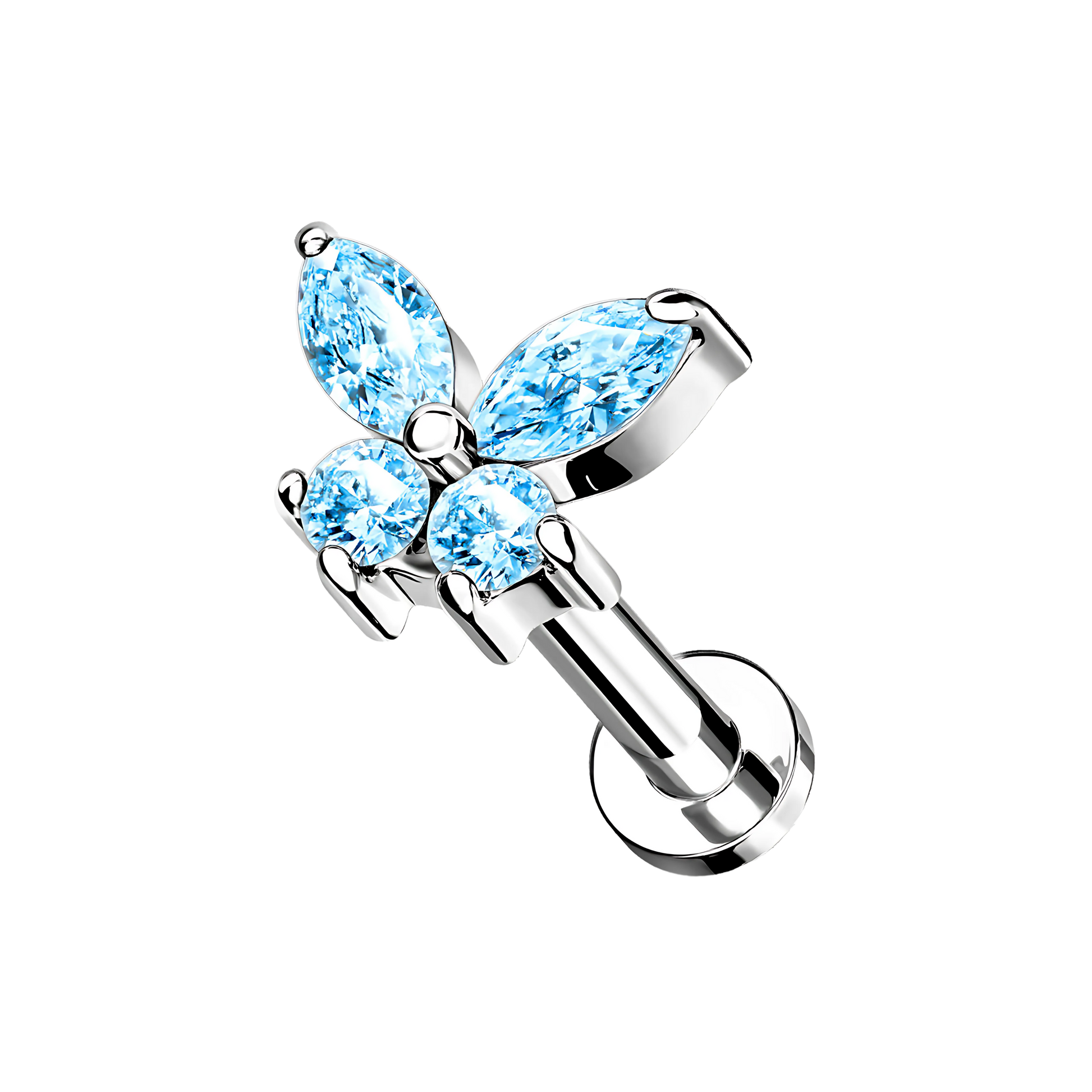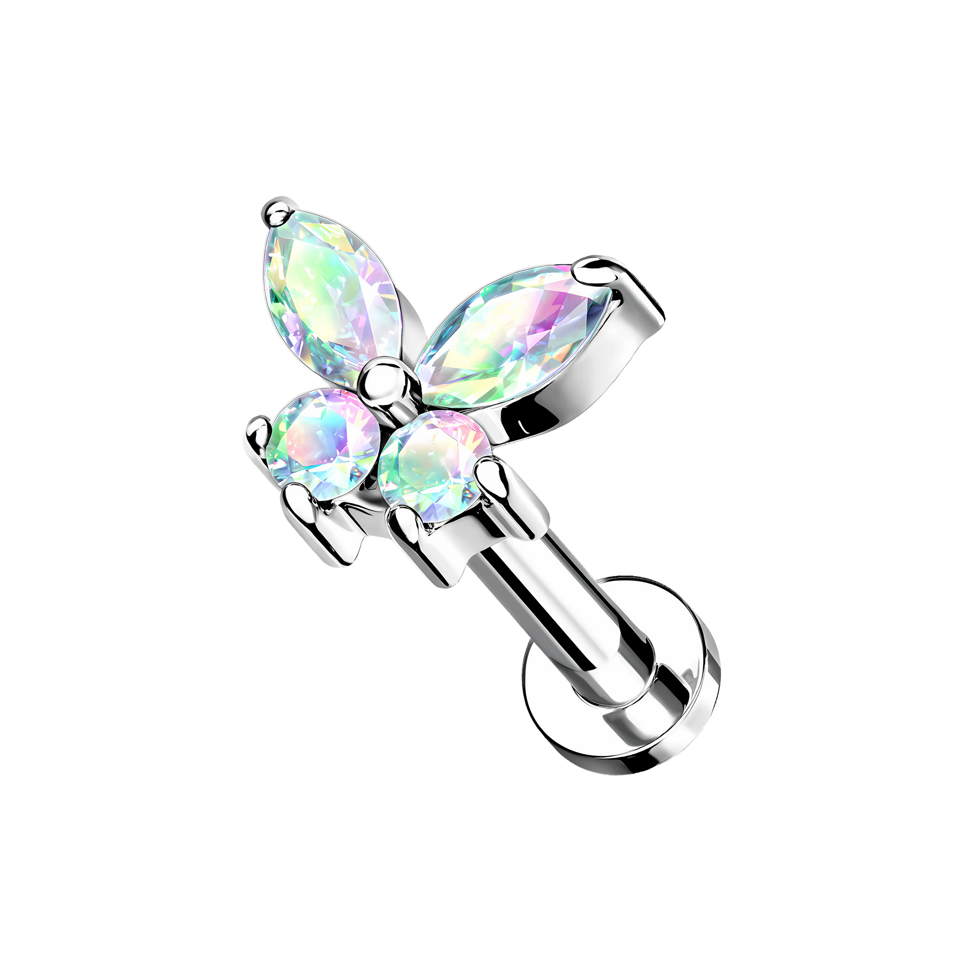 Piercing tipo labret con rosca interna, un diseño en forma de mariposa, disponible en varios colores