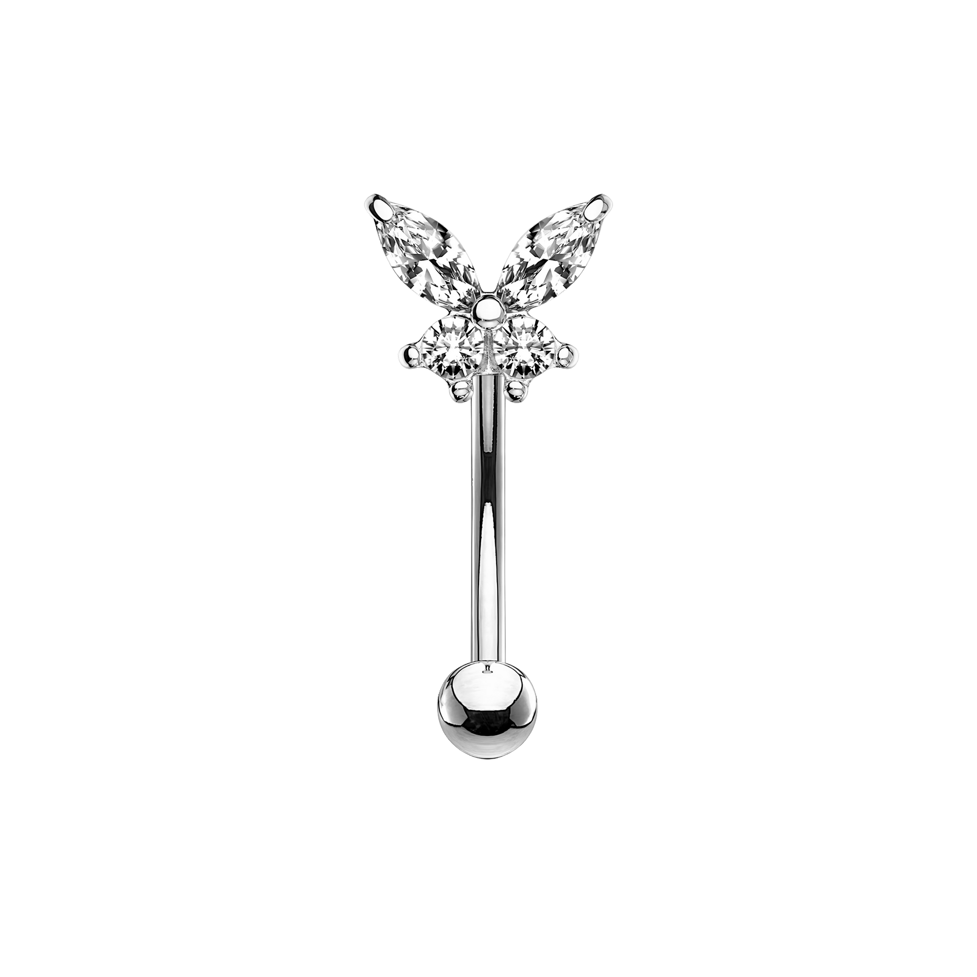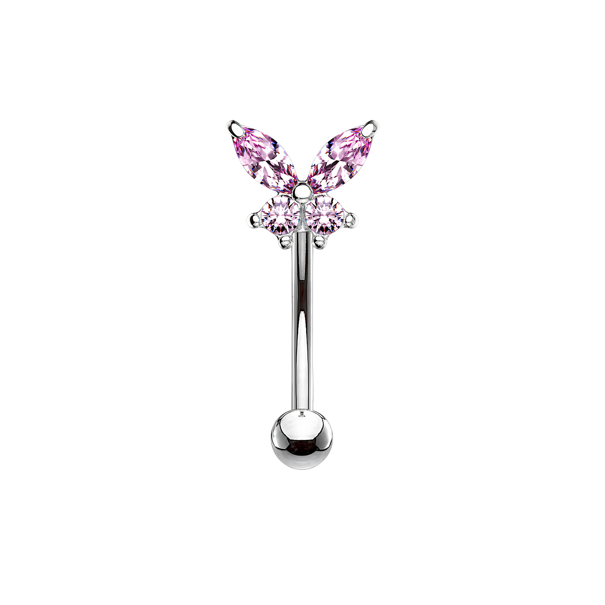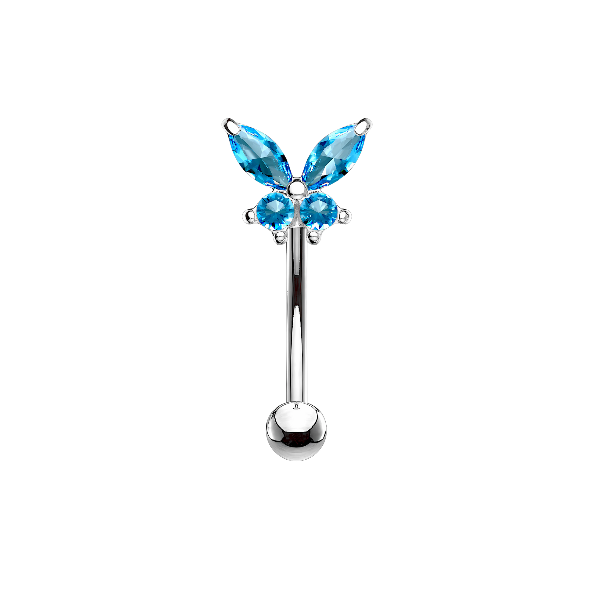 Piercing tipo banana con rosca externa, un diseño en forma de mariposa brillante. Disponible en varios colores.