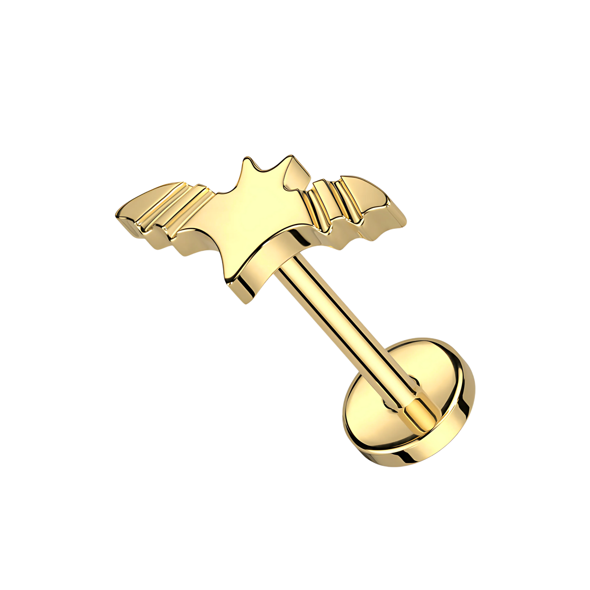 Piercing tipo labret con rosca interna, un diseño exclusivo en forma de murciélago.