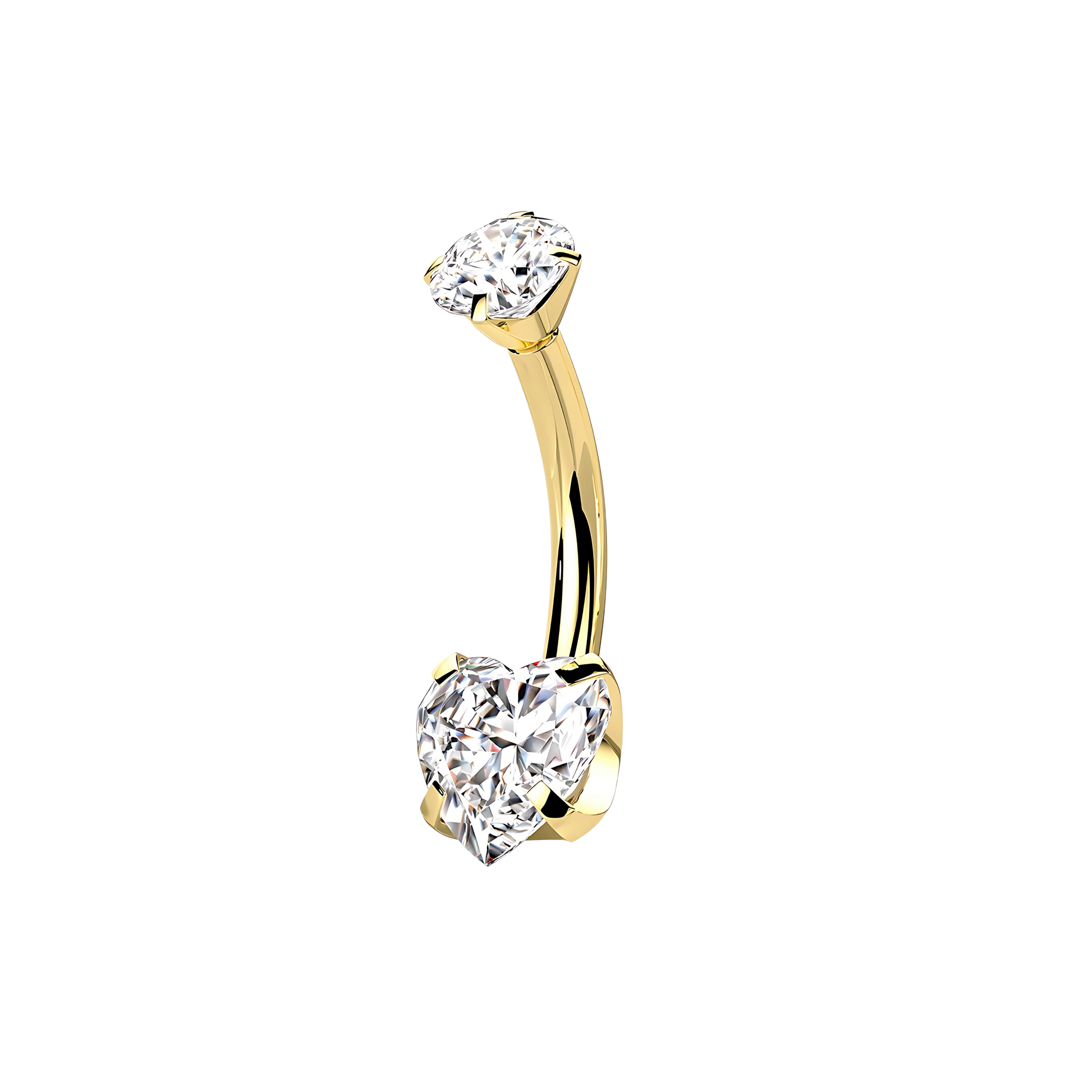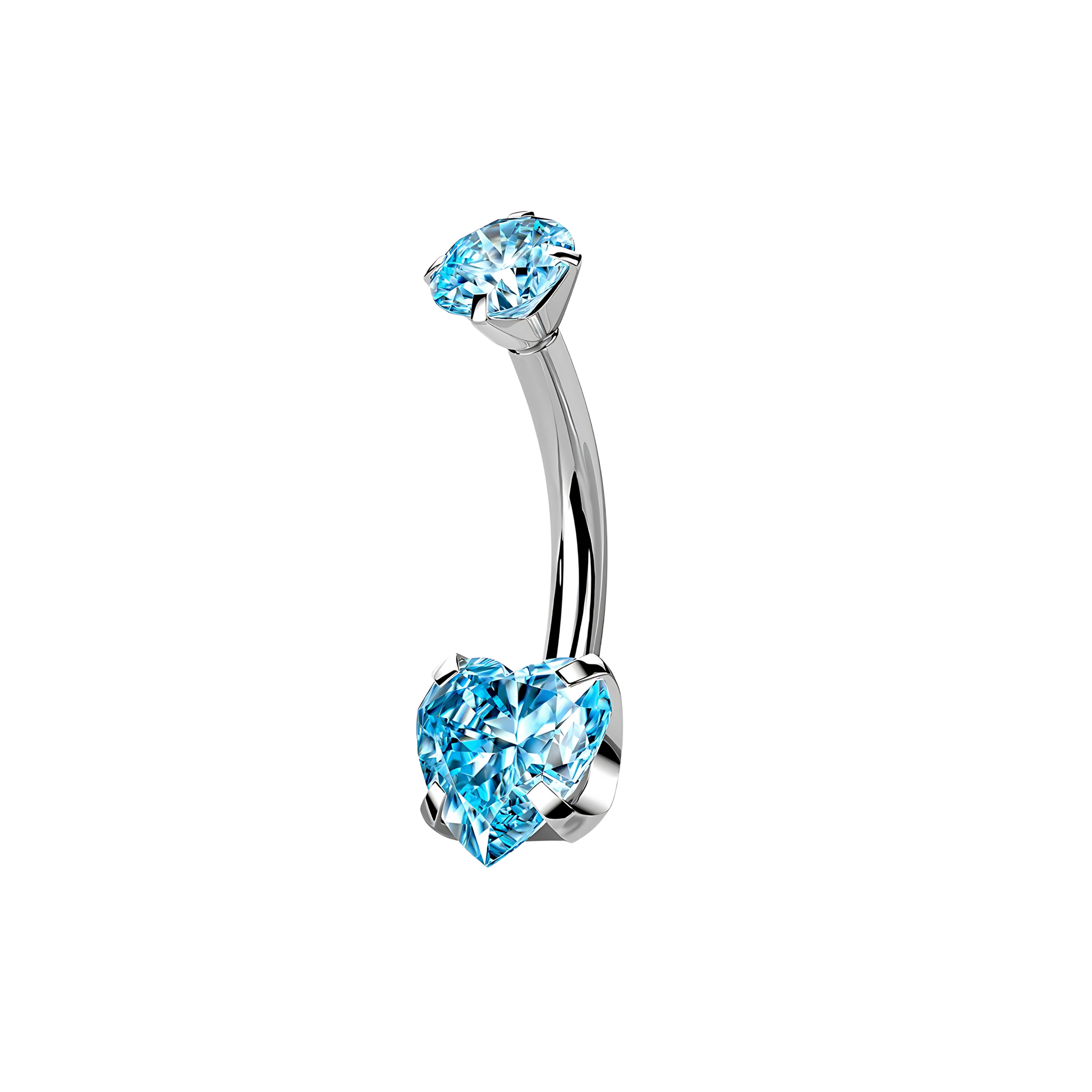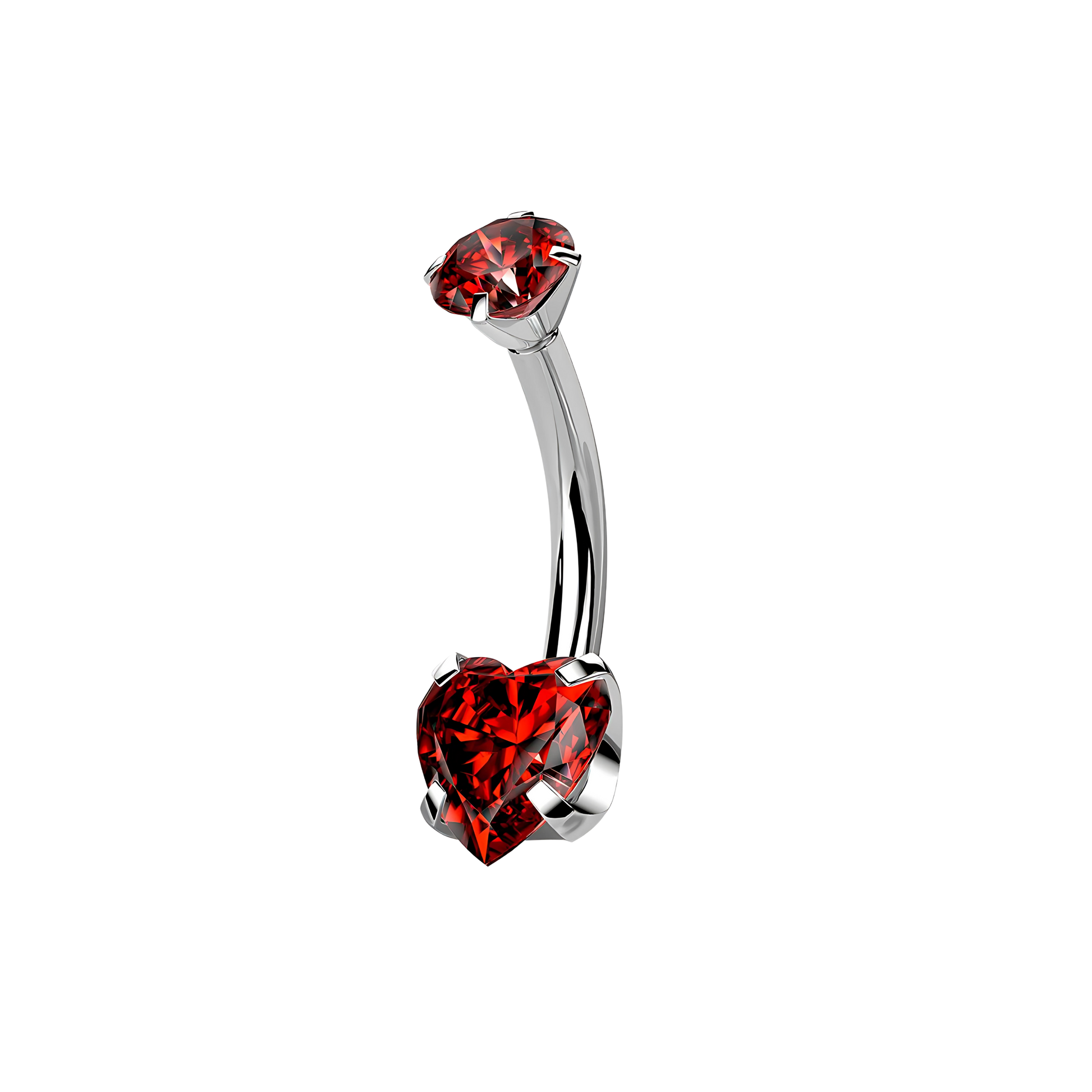 Piercing tipo navel con rosca interna, un diseño brillante en forma de corazón, disponible en varios colores.