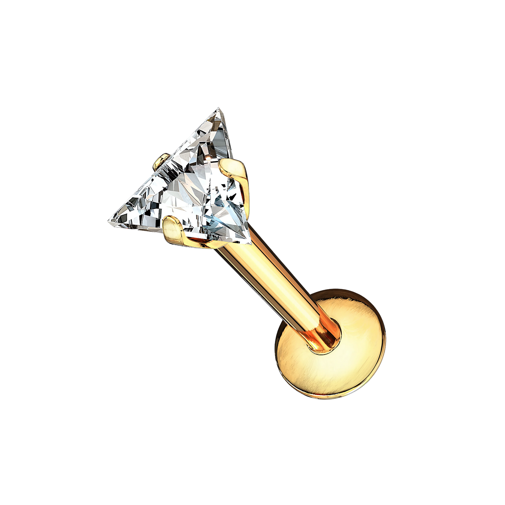 Piercing tipo labret con rosca interna, un diseño brillante en forma de triangulo.