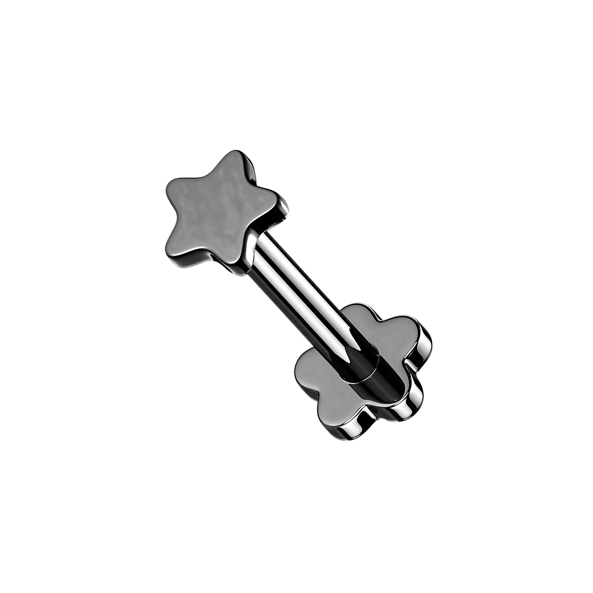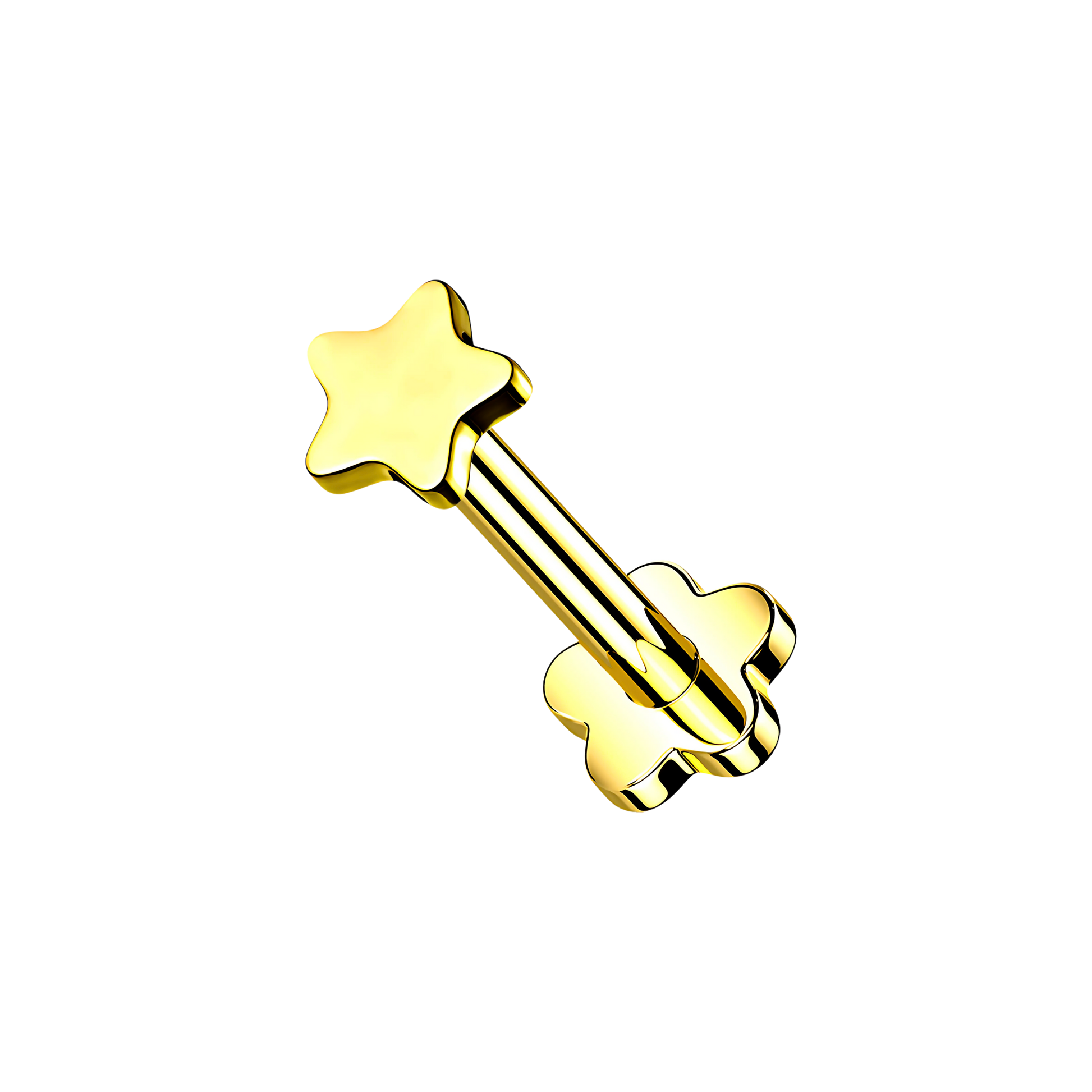 Piercing tipo labret con rosca push-in, un diseño reversible en forma de estrella y flor