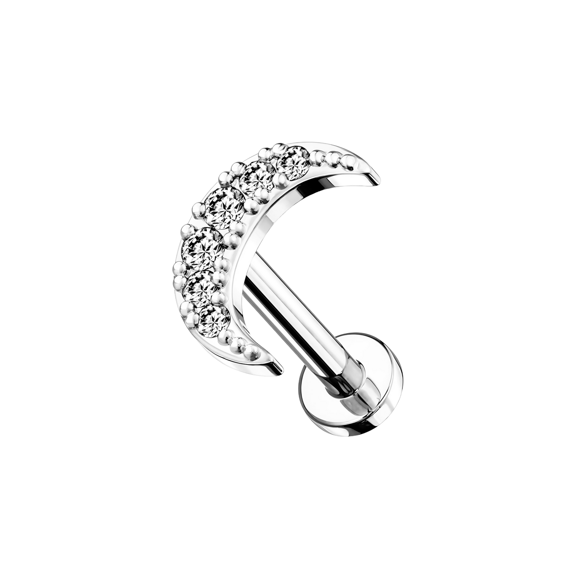 Piercing tipo labret con rosca interna, un diseño en forma de luna.